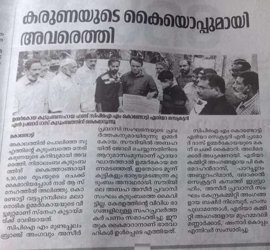 മനസ്സുകൾക്കിടയിൽ ജാതി-മതചിന്തകൾ കൊണ്ട് മതിലു കെട്ടാതെ മനുഷ്യത്വ സന്ദേശത്തിൻ്റെ മാതൃകാ പ്രവർത്തനങ്ങളിലൂടെ അസീർ പ്രവാസി സംഘം.