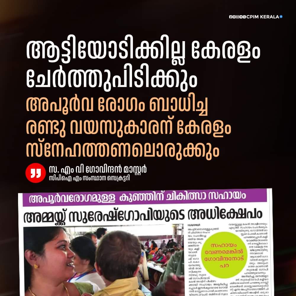 സഹായം ചോദിച്ചുവരുന്നവരെ ആടിയോടിക്കുകയല്ല, ചേർത്തുപിടിക്കുകയാണ് കേരളത്തിന്റെ സംസ്കാരം. ആ കരുതൽ ഉറപ്പാക്കാൻ സർക്കാർ തയ്യാറായിരിക്കുകയാണ്. കുട്ടിയുടെ കുടുംബവുമായി ഫോണിൽ സംസാരിച്ച് എല്ലാ പിന്തുണയും വാഗ്ദാനം ചെയ്തു. ഉടൻ തന്നെ അവരെ നേരിൽ കാണാനാകുമെന്നും പ്രതീക്ഷിക്കുന്നു. കുട്ടിക്ക് ചികിത്സ ഉറപ്പാക്കുമെന്ന് ആരോഗ്യ വകുപ്പ് മന്ത്രി സ. വീണാ ജോർജ് നേരിട്ട് അവരെ അറിയിച്ചിട്ടുണ്ട്. കോയമ്പത്തൂര് സ്വദേശിയും മലയാളിയുമായ സിന്ധുവിന്റെ മകന് വേണ്ടിയാണ് അപൂര്വ രോഗത്തിനുള്ള വിലപിടിപ്പുള്ള മരുന്ന് ആരോഗ്യ വകുപ്പ് നല്കുന്നത്. മലയാളിയുടെ സ്നേഹവും കരുതലും ഒരിക്കൽക്കൂടി ലോകത്തിനു മുമ്പിൽ തെളിമയോടെ നിൽക്കുകയാണ്. സ. എം വി ഗോവിന്ദൻ മാസ്റ്റർ സിപിഐ എം സംസ്ഥാന സെക്രട്ടറി